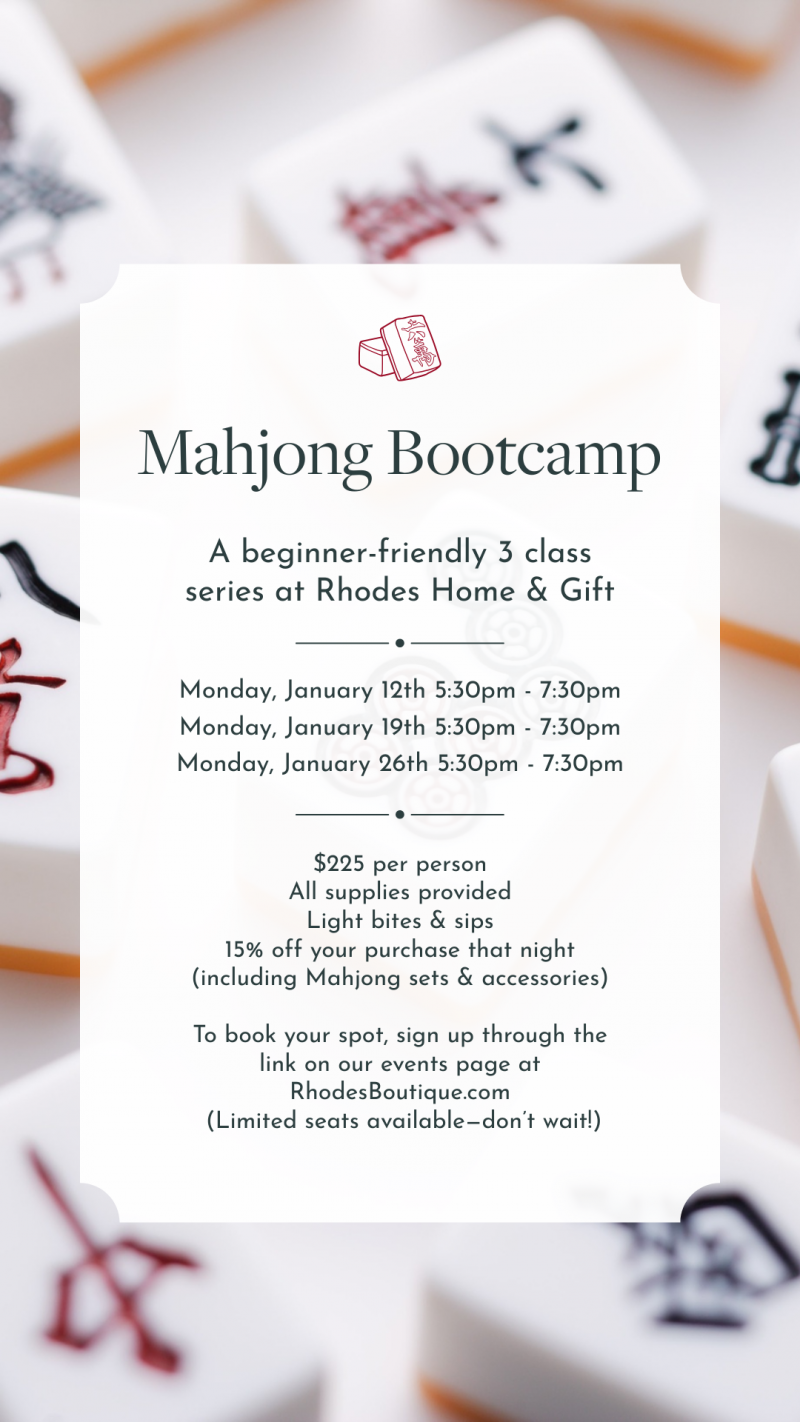 Join our Mahjong Boot Camp Basics (3 lessons 3 Mondays in row) to dive into the fascinating world of this classic tile-based game. Whether you're a complete beginner or looking to brush up on your skills, this class will guide you through the basics and help you develop the strategies needed to become a Mahjong master. Week 1 we will learn the tiles and basic how to play and the rules. Week 2 we will do a quick recap and dive right into playing. Week 3 we will do a quick recap of week 2 and dive deeper into some strategy, etiquette and work on pace of play. We will provide everything you need to learn and play! Light bites and fun sips will be provided as well.