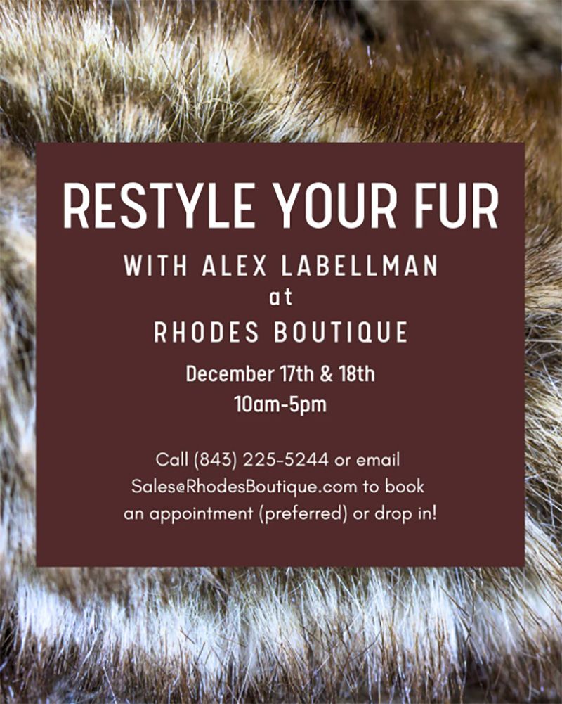Give your fur a fresh new life just in time for the season. Whether you’re looking to modernize an heirloom piece, repair a favorite coat, or reimagine your fur into something completely new, expert furrier ALEX LABELLMAN will be at Rhodes Boutique DECEMBER 17TH & 18TH FROM 10AM–5PM.