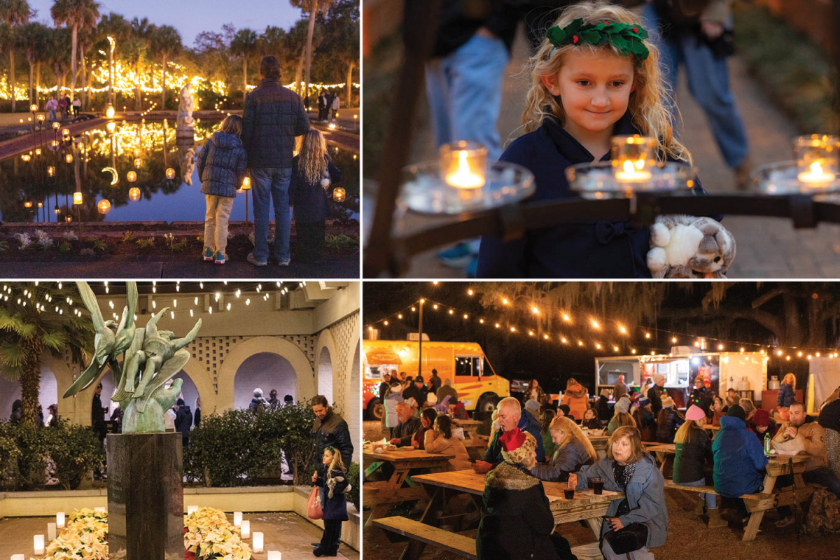 (Clockwise from top left) Stratton and his children gaze across a reflection pond just after sunset; daughter Tade takes in a few of the thousands of candles; chicken bog and hot chocolate are on offer at the food truck corral; a “cranberry bog” framed by white poinsettias makes a striking impression.