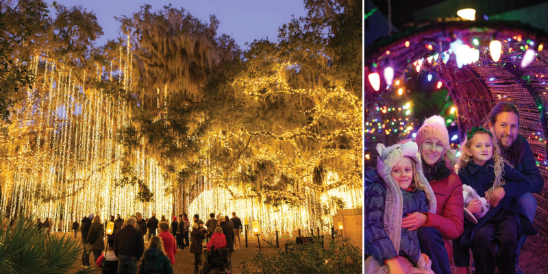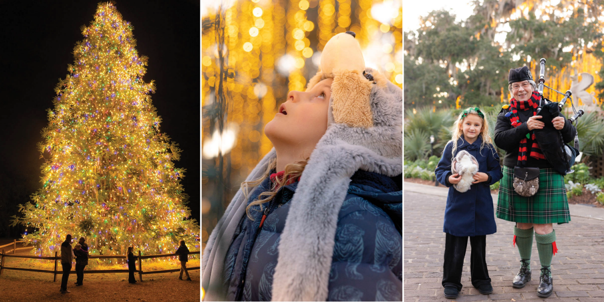 (From left) Brookgreen Gardens’ soaring China fir is one of the Southeast’s grandest Christmas trees; Stratton’s son, McRae, takes in the array of LED vines overhead; Tade poses with her new bagpiper friend during a quick break from Scottish-tinged carols.