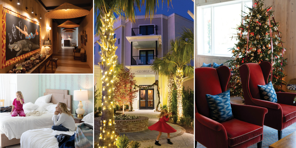 (Clockwise from top left) A mural by Charleston artist David Boatwright welcomes guests down a hallway at The George; Tade twirls outside the boutique hotel in Georgetown that opened in 2024; the cozy lobby, decked out for the holidays; the rooms at The George are relaxed yet refined.
