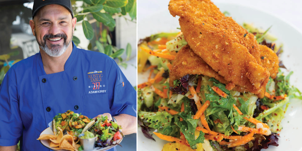 Bistro 217 chef-owner Adam Kirby delivers a plate of bang-bang shrimp tacos; his flounder filet over local greens.