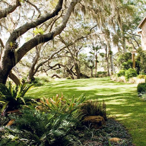 With poor soil, the bed near the marsh is tricky, says Bunny, but azaleas, giant liriope, fatsia, and star jasmine create a pretty swinging spot for visiting granddaughters.