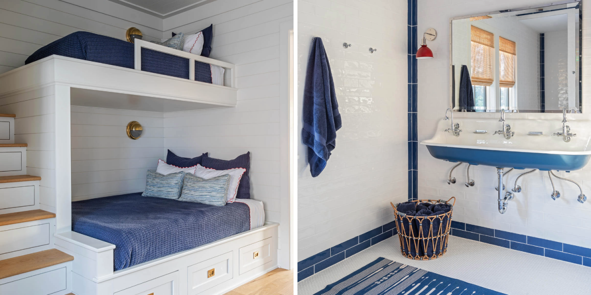 A bunk room over the garage also pops with a bold, deep blue incorporated into a tile pattern and vintage sink in the bathroom. With the garage set apart from the main home, Vogel designed a glass-encased gallery that provides a light-filled transition from outside to in.
