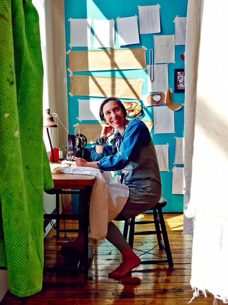 An historic, brick mill building on Columbia’s Whaley Street, within earshot of the railroad tracks, is where we soon meet again. Upstairs, in a room lined with tall, steel-frame windows, frocks of cotton dyed in water from the Congaree River, rust, and indigo float on hooks and hangers above Magar, who’s dressed this day in layers of her own indigo-dyed dresses made with purposefully unfinished hems. “I’m tired of perfect-land,” she says, when I ask about the frayed edges. “I’m obsessed with dishevelment—my first dresses were inspired by unraveling at the seams.”