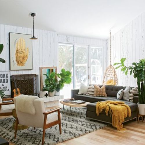 In regards to selecting colors, the palette throughout is mostly muted. “It’s very classical, white and grey, with some bold accent walls,” Naylor notes. Against a neutral backdrop, those bright notes shine without overpowering. In the living room, for example, an orange wall and a colorful oversize portrait by Brazilian artist Robson Reis Marques are tempered by white walls, neutral furnishings, and a solid black rug. In the dining room, Naylor had the fireplace surround and adjacent built-ins painted black. Rows of succulents in terra-cotta pots and a piece by local artist John Duckworth provide contrast and visual interest.