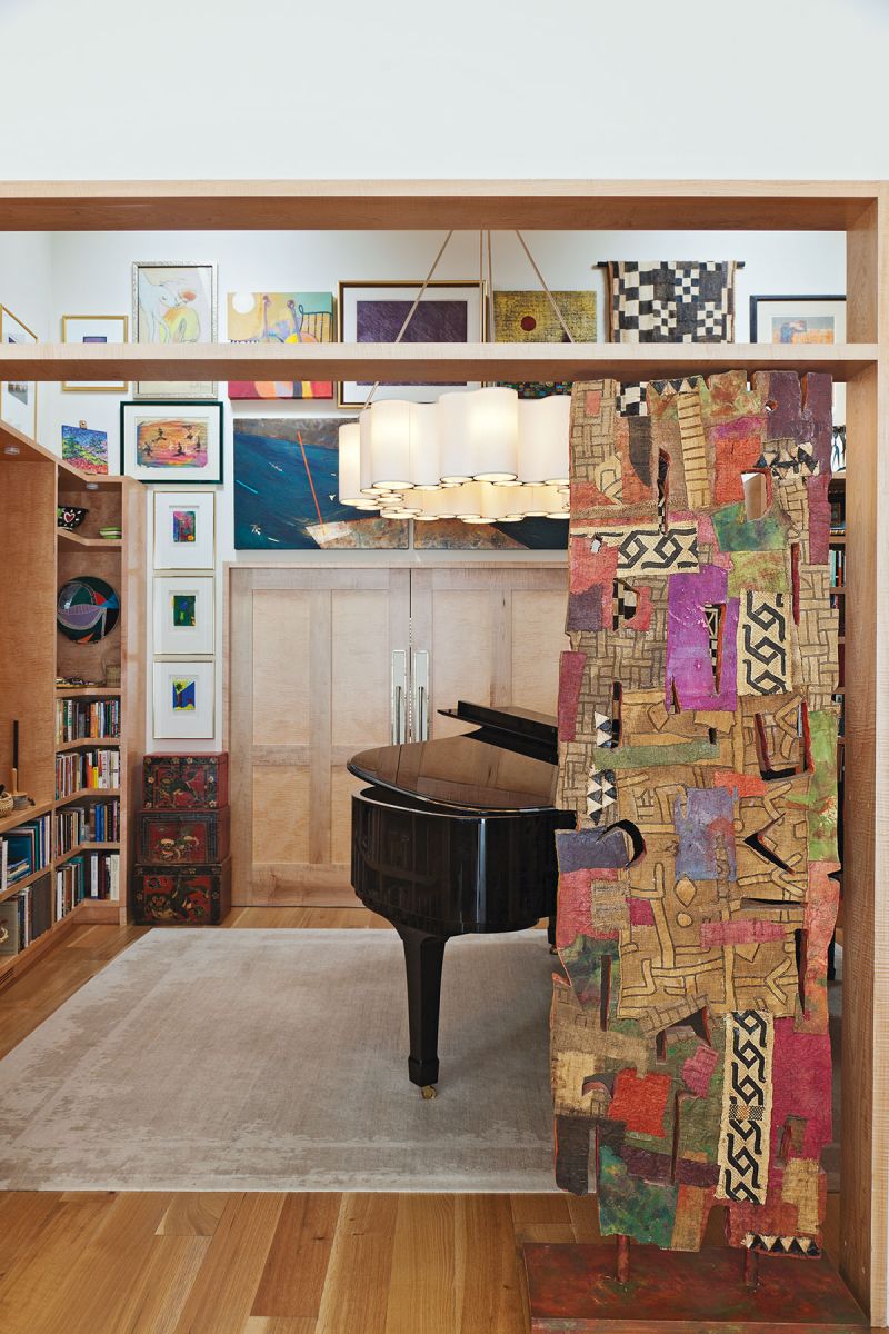 Post-construction, three of the original first-floor rooms serve as a butler’s pantry, study, and music room, while the new structure adds a screened porch; covered outdoor kitchen; primary bedroom; and open kitchen, dining, and living space, all built to the smaller scale the homeowner requested. “It’s like an old-fashioned ranch house,” she says. “When I’m in my bedroom, I can talk to someone in the kitchen without raising my voice.” And though the house feels cozy, clever design details allow it to seemingly expand to accommodate guests. For example, along the perimeter of the living room, built-in storage benches provide ample seating during parties. To better integrate the original rooms into the addition, Gibson designed an angled wall that runs along the entryway, gradually widening as it stretches out into the home. “It draws you in,” he says. And in several original rooms, he swapped out walls for floor-to-ceiling wood and glass shelves, which foster a feeling of openness. The partitions were custom-built around a few of the homeowner’s favorite artworks, such as a large, colorful piece by William Halsey that fits right into the doorway of the music room. “This was very purposeful,” she says. “It’s the first time I’ve had a chance to display both sides of the sculpture—it was always pushed up against a wall.”