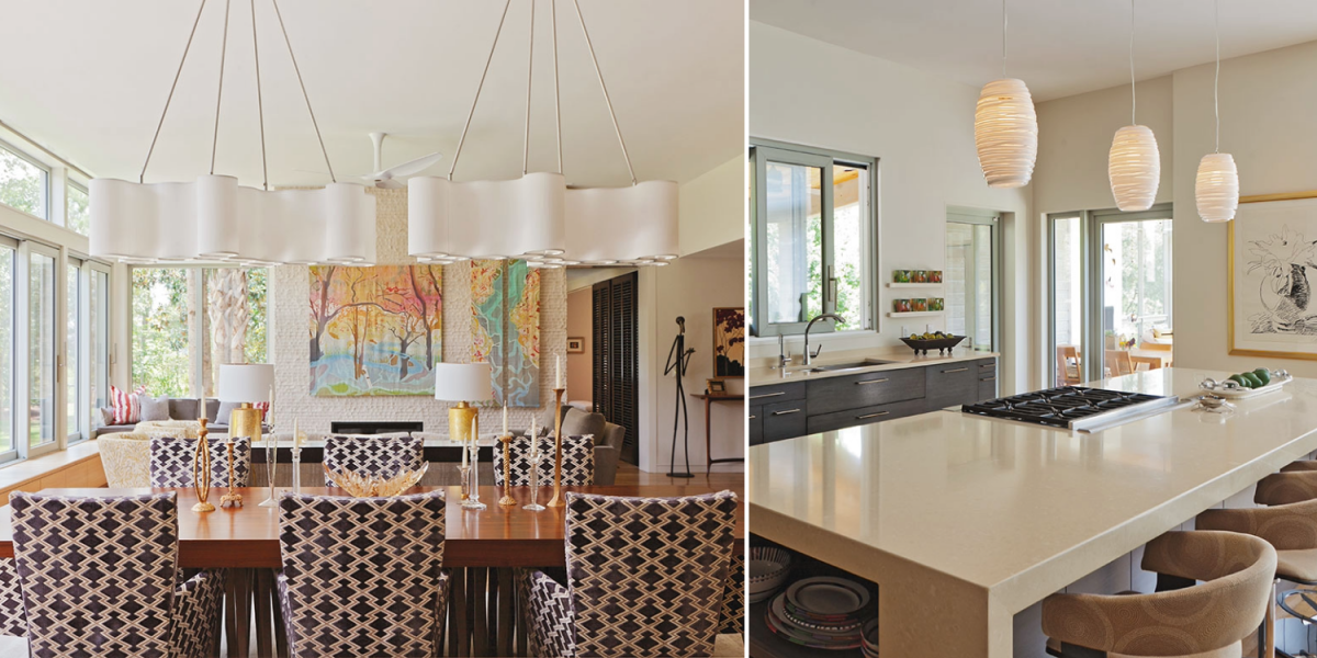 The homeowner has a colorful personality and loves patterns. Knowing this, Sanchez set out to create an interior design that was bold enough to suit her client’s tastes, yet low-key enough that it wouldn’t distract from the long marsh views or the amazing art to be displayed in the home. She selected furnishings with a low profile, then layered in neutral textiles in an array of patterns and textures—diamond weave, flame stitch, modern floral, ikat, velvet, and more all live together harmoniously. The palette allows prized possessions, such as the black-and-white Andy Warhol hanging in the kitchen and the custom batik by local artist Mary Edna Fraser that cleverly conceals the living room television, to shine. “Even the walls are a soft creamy shade because it helps to highlight the art without detracting from all the other elements,” Sanchez says.