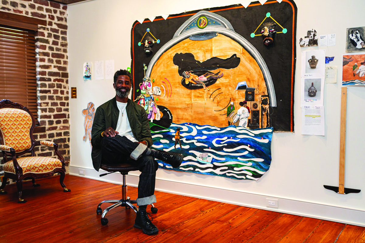Evelyn’s local lecture for the Episcopal Diocese led to a conversation with Calvary and a subsequent collaboration to create The Calvary Icons, a permanent contemporary altarpiece that is in its fundraising phase. To be fashioned from medium-density fiberboard, the piece’s swirling forms and colors will complement the sanctuary’s iconic 20th-century stained-glass window above the altar and were developed through careful listening and local engagement. “I have to go out of my way to build trust…. I’m always listening, and I can repeat back quite confidently what [the church’s] challenges are,” Evelyn notes. The artist, whose family is originally from Jamaica, has gained a deeper sense of the Caribbean connections in Charleston, spending part of his time in the Lowcountry.