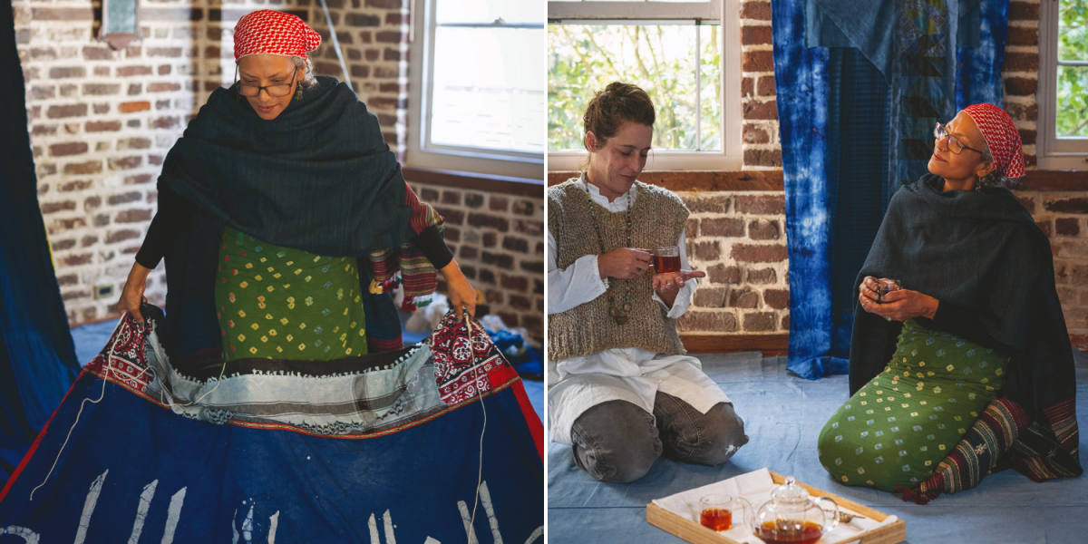 Amina Ahmed, a multidisciplinary artist whose work includes painting, printmaking, and textiles, was a fall artist in residence at the Foundation for Spirituality and the Arts (FSA). (Left) Ahmed displays textiles at the culminating garden party and open studios reflective of her indigo-dyeing immersion and collaboration with local artist Precious Jennings (right).