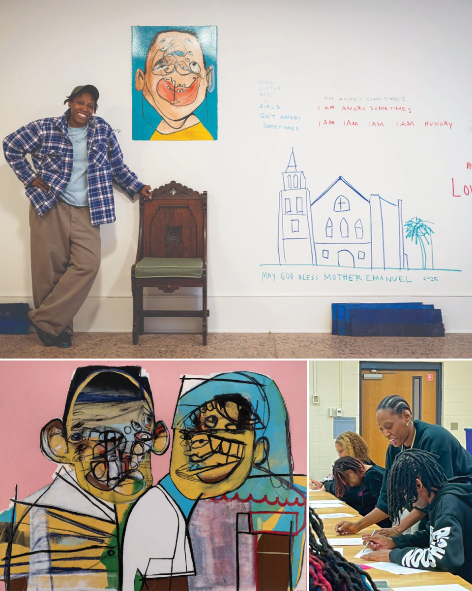 During her residency, Tramaine spent four weeks with seniors at Burke High School, teaching the fundamentals of portraiture and asking them to sit in self-reflection as they navigate the tricky transition to adulthood. “You really have to sit with self, and that’s usually uncomfortable for students,” she says. She did the same herself, reconnecting spiritually by visiting churches, including a Bible study at Mother Emanuel AME Church, and connecting with people during frequent forays around the city. “Under my hat, I’m listening more than I’m speaking,” she muses, patting its top.