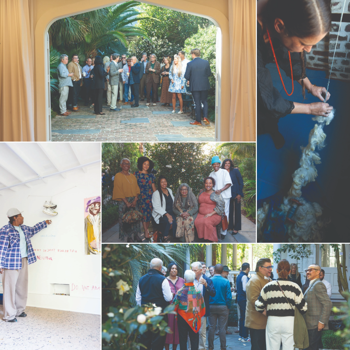 FSA celebrates the end of the artists’ residencies with a garden party, opening their studios to community members and fellow artists. (Center) Tramaine and Gude join honored guests, including International African American Museum curator Isabelle Britto (standing, second from left) and batik artist Arianne King Comer (seated, center).