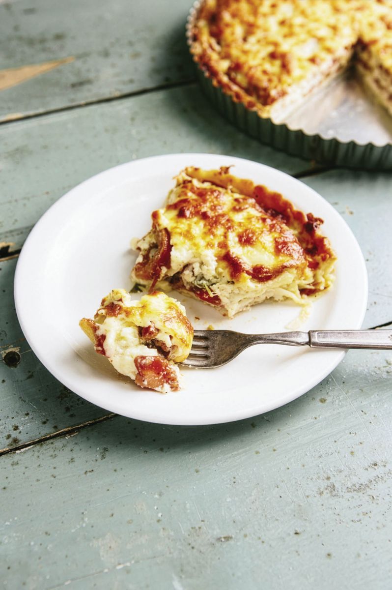 Start assembling the pies with a thin layer of cheese on the bottom of the crusts. Top with a layer of sliced tomatoes and season with salt and pepper. Add a light layer of onion and basil, followed by the mayo mixture. Repeat until the filling comes within one-quarter inch of the crusts. Cover the final layer with cheese.