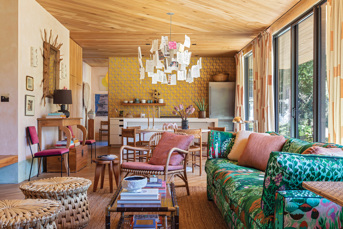 In the kitchen, the sunny theme continues with a wall of yellow zellige tiles. Free of upper cabinets, the minimalist space features a single wooden shelf and a concrete island, creating a calm, zen-like atmosphere. The adjacent dining area is anchored by an iconic Eero Saarinen “Tulip” table beneath Ingo Maurer’s whimsical “Zettel’z 5” chandelier. Part light fixture, part art piece, it features dangling love letters in various languages, plus her own personalized notes and photographs.