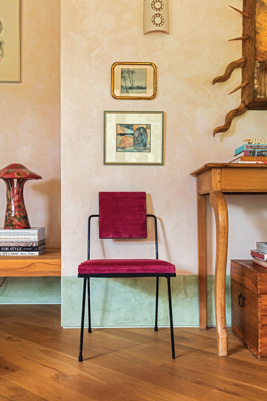 It wasn’t until 2022, after the custom woodwork had been installed and the Venetian plaster had dried, that Hranowsky considered the home complete. Crafted in cypress, the bookshelves and pantry bookend the open-plan living space, connecting the white oak floors and ceilings, while the peach plaster walls provide a soft backdrop for bold tile accents, contemporary lines, and the designer’s collection of furniture and art.