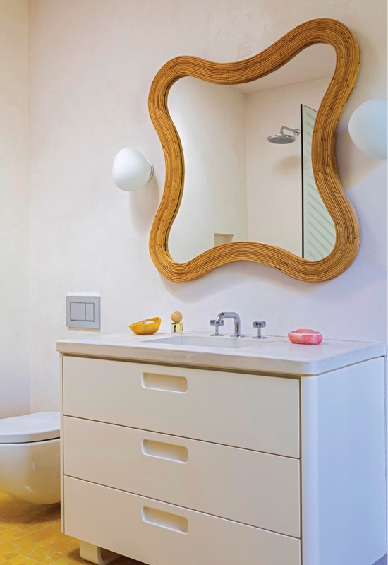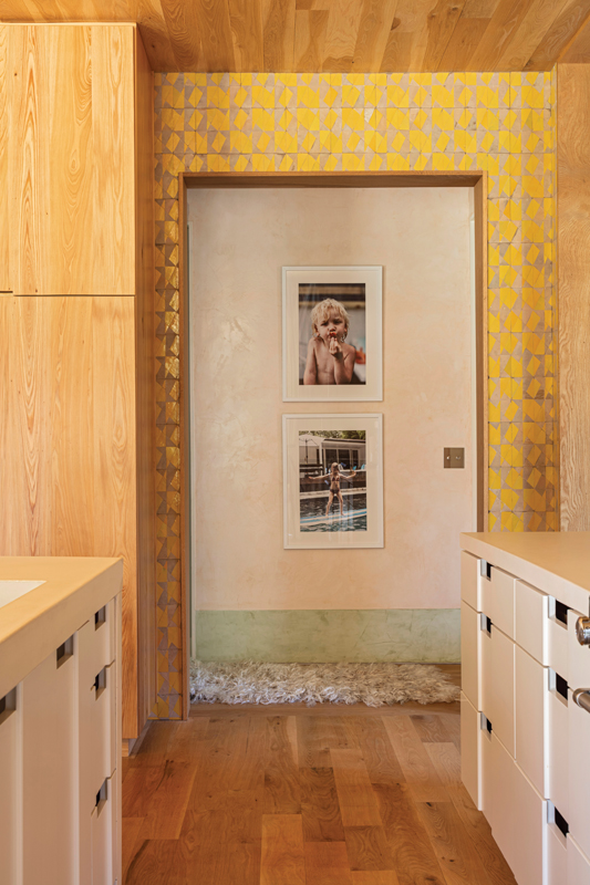 The primary bathroom does double duty as a large closet, with intricate lattice doors to contain clutter and allow the room to feel sophisticated and simple. The yellow tiled floor and lime-based, waterproof Tadelakt plaster create a warm, soft space that’s flooded with natural light.