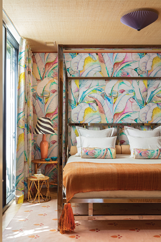 Her bedroom is a maximalist’s paradise, papered in a reinterpretation of CW Stockwell’s iconic “Martinique” print by Voutsa. The flamboyant pattern pays homage to Los Angeles (the design once graced the Beverly Hills Hotel), while evoking a touch of Miami glamour—Hranowsky’s favorite cities. The primary bath continues the bold tile story with yellow zellige in the shower and walls coated in waterproof Tadelakt, a traditional Moroccan plaster.