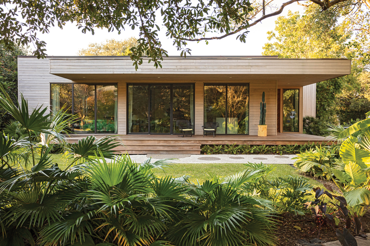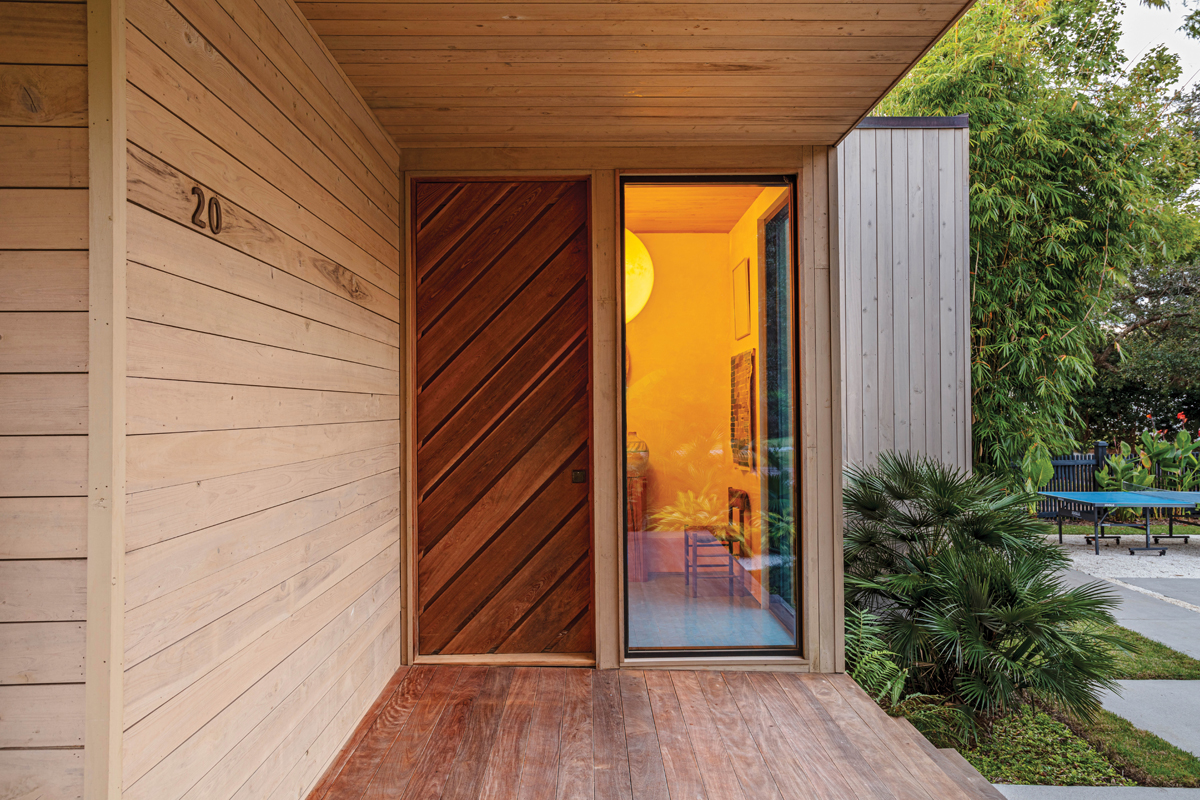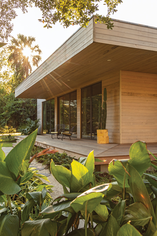 Outside, a wide, cypress-planked deck opens to a verdant garden planted in 2020. Towering palms out front and thick bamboo in the backyard create a lush retreat. “I like tropical,” Hranowsky declares. “The more tropical, the better.”