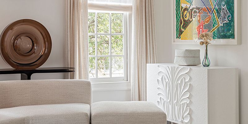 “The use of window walls in the main living space was a primary design element, allowing the connection to the landscape and riverscape,” explains Judy Dixon, one half of the husband-and-wife architecture team. In the private spaces, the use of natural light was more sparing yet targeted. “The corner windows of the primary bedroom bring the historic live oak canopies and river patterns into this space,” says Dixon. “The singular tall window aligned as you are walking down the stairs is yet another way the view is woven into the flow of the house.”