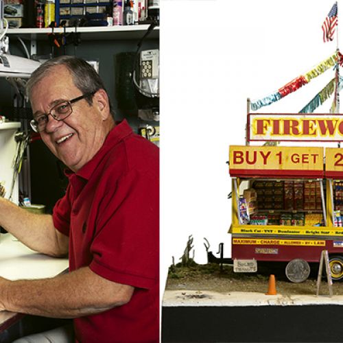 Julia Deckman in her studio at Redux Contemporary Art Center; all but the miniature works are from her “Sill Series.”