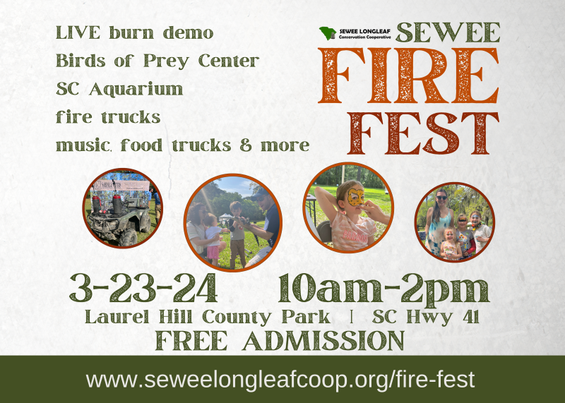Join The Nature Conservancy and the SEWEE Longleaf Conservation Cooperative at Laurel Hill County Park to learn and engage with local organizations who bring safe, controlled prescribed fire to South Carolina's forests.  Guests can meet Burner Bob, view forest burn demonstrations, enjoy local bluegrass music, engage wildlife with the Birds of Prey Center and  SC Aquarium plus interact with other conservation focused organizations.  Join us as we promote safe and effective prescribed fires and what our communities can do for a healthier ecosystem. Laurel Hill County Park; 1400 SC Hwy 41, Mt. Pleasant https://www.seweelongleafcoop.org/fire-fest