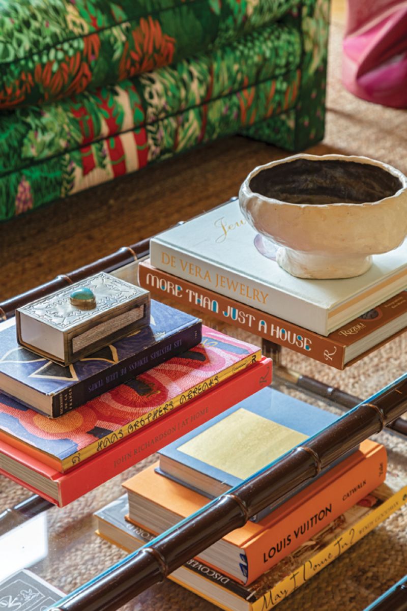 A vintage sofa covered in Jim Thompson’s “Melusine” fabric in “Sweet Nymph” dominates the main living space. Tucked under the end table is a fuchsia fiberglass stool from L.A. Studio in Madrid. But it’s the books that are the star of the show. “I incorporate bookshelves whenever possible into clients’ homes, and they are a source of joy and inspiration in my own,” says Hranowsky. “Books can tell you a lot about their owners. My collection is full of fiction and nonfiction, design books from interiors to graphics to architecture, along with art books and books I collect purely for the originality and beauty of their design.”