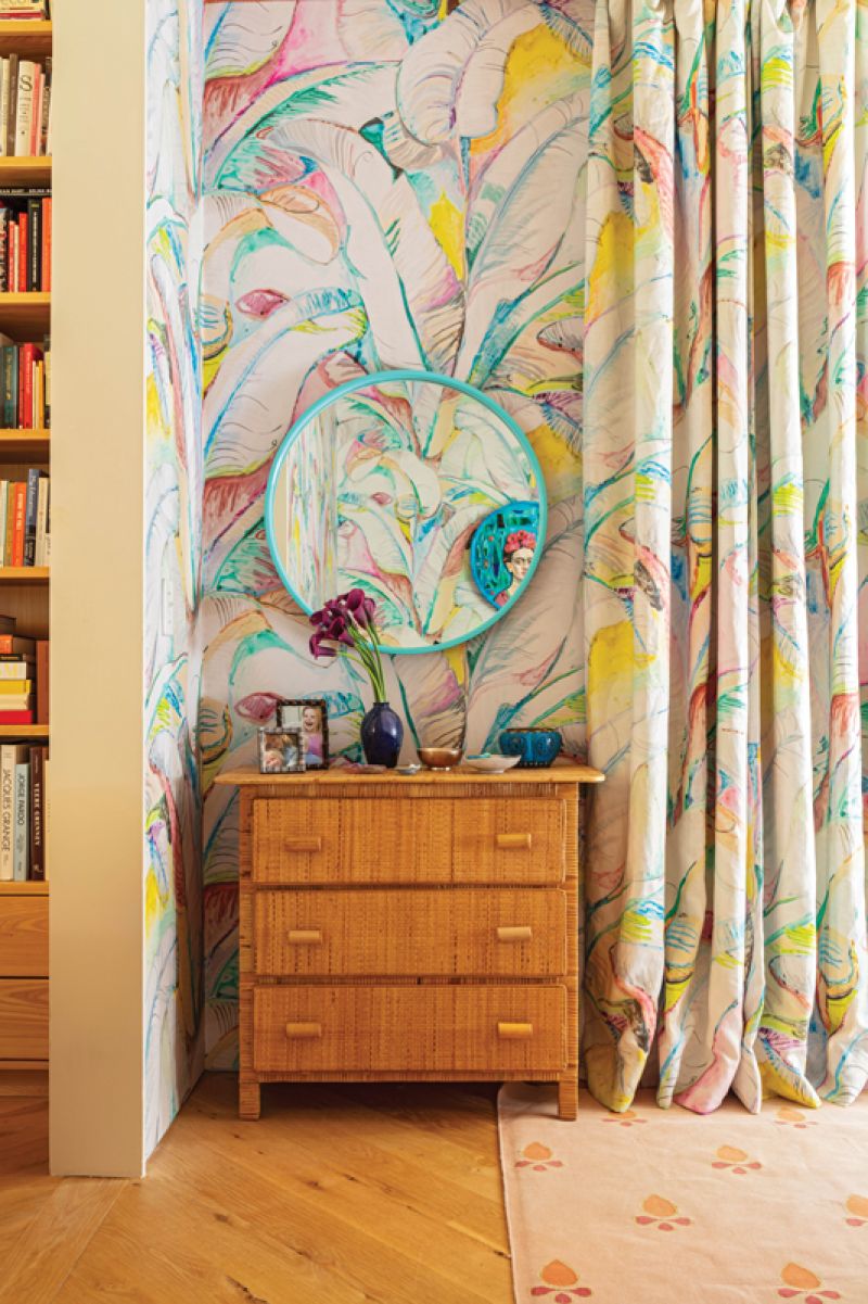 The primary bedroom is swathed in a vibrant, banana-leaf print. A collaboration between Voutsa and CW Stockwell, the pattern is a reinterpretation of Stockwell’s iconic “Martinique” print originally designed for the Beverly Hills Hotel. “For me, it’s a collision of Miami and Los Angeles, two cities I love,” says Hranowsky. She commissioned artist Doug Meyer to create the cameo of Frida Kahlo.
