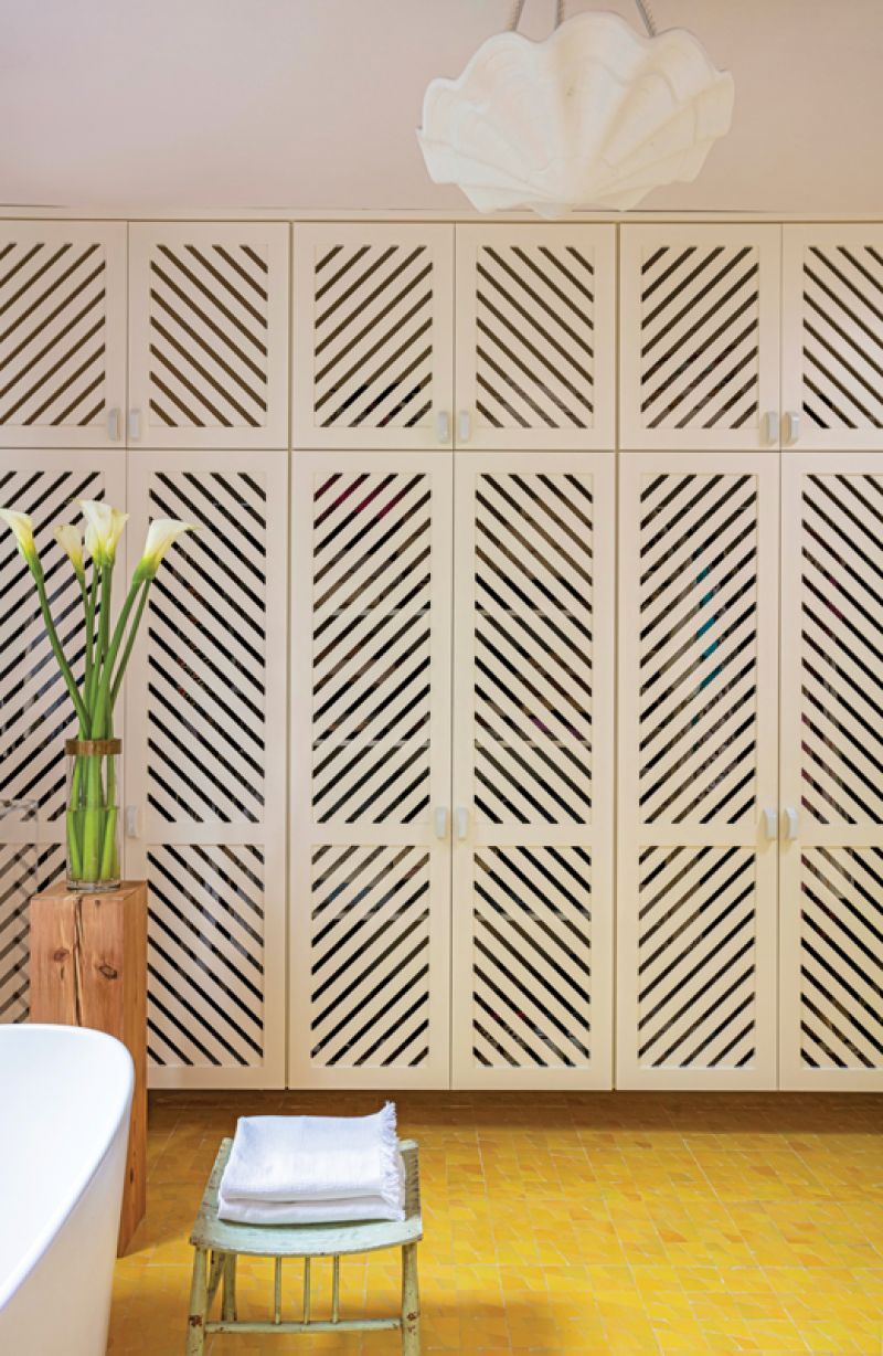 The primary bathroom does double duty as a large closet, with intricate lattice doors to contain clutter and allow the room to feel sophisticated and simple. The yellow tiled floor and lime-based, waterproof Tadelakt plaster create a warm, soft space that’s flooded with natural light.
