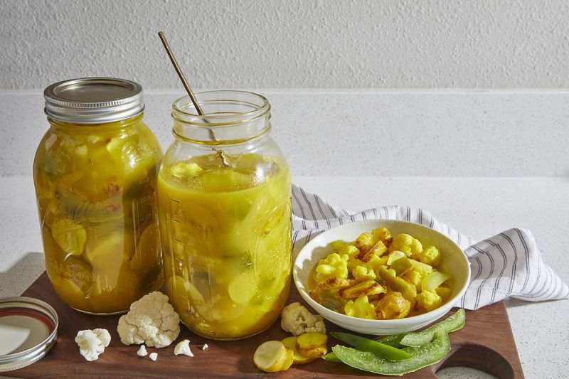 Slice or chop artichokes and onions. Cut peppers fine and break cauliflower into flowerets. Mix all together and cover with salt and water. Let stand twenty-four hours. Pour into colander and drain well. Mix all dry ingredients for sauce and add enough vinegar to make a paste. Heat rest of vinegar and pour over mustard mixture. Return to stove and boil until it thickens, stirring constantly. Add vegetables, bring to boil and seal in jars while hot.