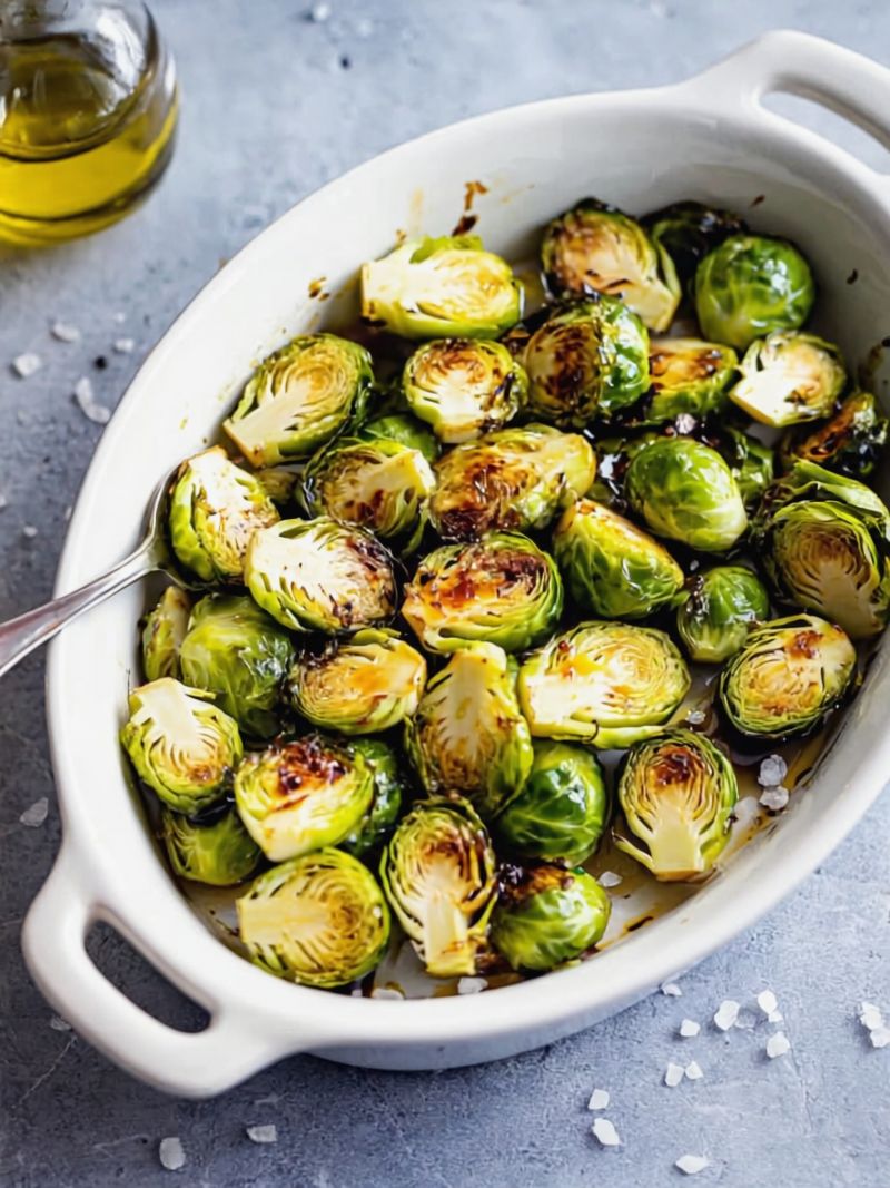 Combine the Brussels sprouts, olive oil, and balsamic vinegar in a large mixing bowl and toss. Season to taste with the next five ingredients. Spread on a large sheet pan and bake for 15 to 20 minutes, until tender and browned. Cooled and covered, the sprouts will keep in the refrigerator for up to three days. Reheat in a microwave for approximately 1½ minutes.