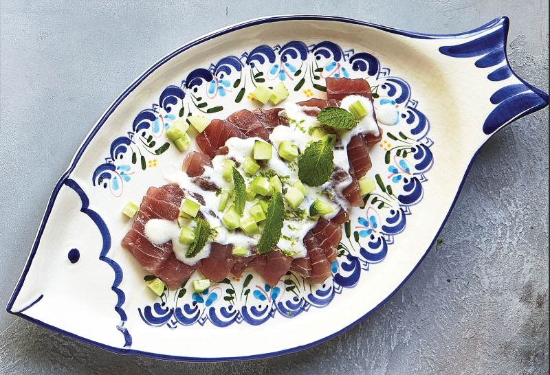 Thinly slice the tuna, place in one layer on a plate, cover, and refrigerate.