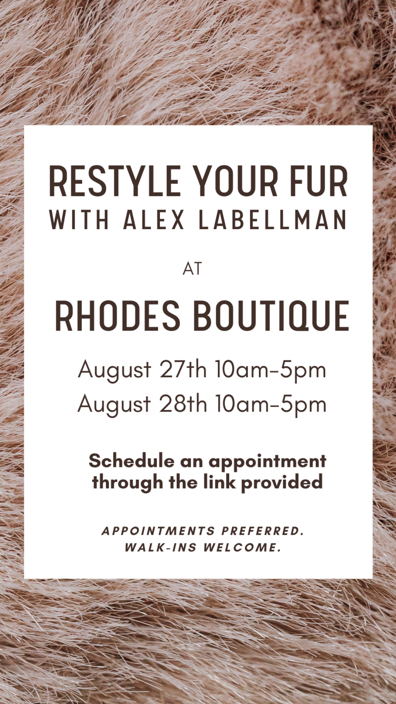 Join us at Rhodes Boutique on Wednesday, August 27th and Thursday, August 28th from 10am to 5pm for a Restyle Your Fur event with the renown LaBelle Furs. Bring your furs for restyling, alterations, repairs, cleaning, or appraisals. Plus, shop the newest collection of luxury fur garments.