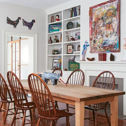 To draw out this motif, she fused mid-century furnishings (“If you want to go retro, mid-century pieces have the cleanest lines,” she says) with picks that have an edgy feel, such as the Banksy-esque painting above the living-room mantel (“It looks like the dark side of corporate America,” she notes), the angular chandelier over the dining table, and the rock-and-roll wallpaper in the first-floor powder room. The wallpaper was a DIY job the couple tackled in one weekend, raiding coffee-table books for images of favorite musicians and gluing them to the wall. “Brad is obsessed with New Orleans jazz musicians, so they’re in there, and I grew up in the ’80s, so Madonna has a presence,” she says. Upstairs, a more intimate personal touch: in a hang space between the twins’ rooms, Melissa placed a grouping of skateboard decks that once belonged to her late brother. “He lived life to the fullest; I like these little reminders of him,” she says.